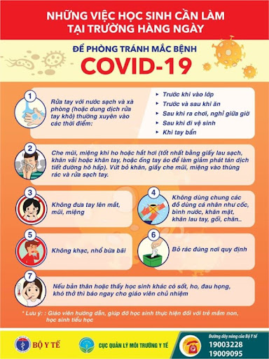 Để phòng chống dịch bệnh COVID-19 hiệu quả, Bộ Y tế đã và đang phát triển các nội dung Khuyến cáo, Hướng dẫn và sản phẩm truyền thông nhằm xây dựng các thông điệp chi tiết đến từng đối tượng cụ thể. Sau đây là infographic Khuyến cáo những việc học sinh cần làm tại trường hàng ngày.