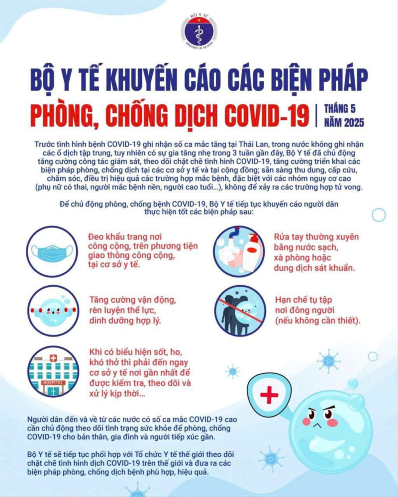 Tại Hà Nội hiện nay, số ca mắc Covid -19 đã tăng đáng kể. Bộ Y tế nhận định gia tăng số ca mắc liên quan đến việc đi lại, tự tập nơi đông người trong dịp lễ. Bộ Y tế khuyến cáo mọi người không chủ quan. Để chủ động phòng, chống dịch, Bộ Y tế khuyến cáo người dân thực hiện đầy đủ biện pháp phòng, chống sau: